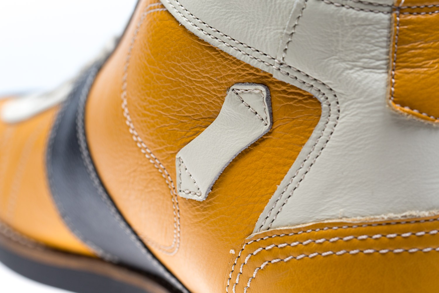 This yellow, white and black retro sneaker "the Kicker" is inspired by soccer shoes from the 1930s, when German shoe manufacturers revolutionized the technology surrounding sports shoes. Over the years, shoes became lighter and made exclusively for use in the field. Our version of the Kicker brings back the robust football shoe made of real leather as an everyday sneaker for the street. It features ankle protection and a small leather loop that allows the laces to be wrapped around the leg to increase support